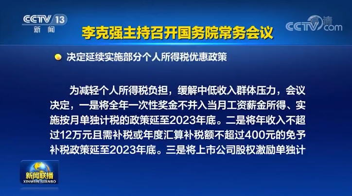 12月29日,国务院常务会议决定延续实施部分个人所得税优惠政策,其中包括将全年一次性奖金不并入当月工资薪金所得、实施按月换算税率单独计税的政策,延续至2023年底。